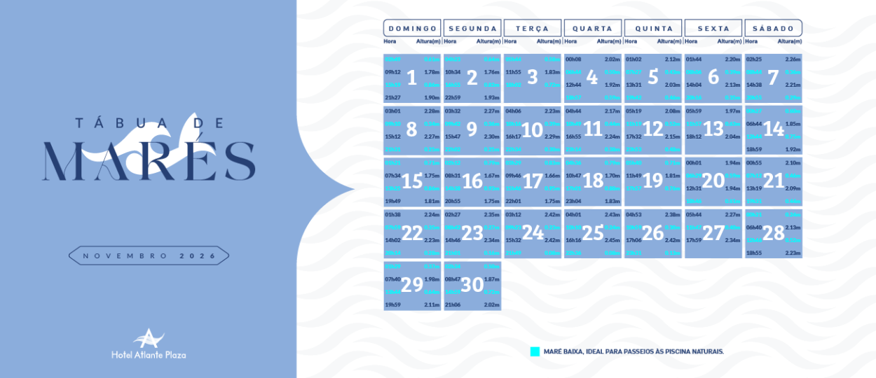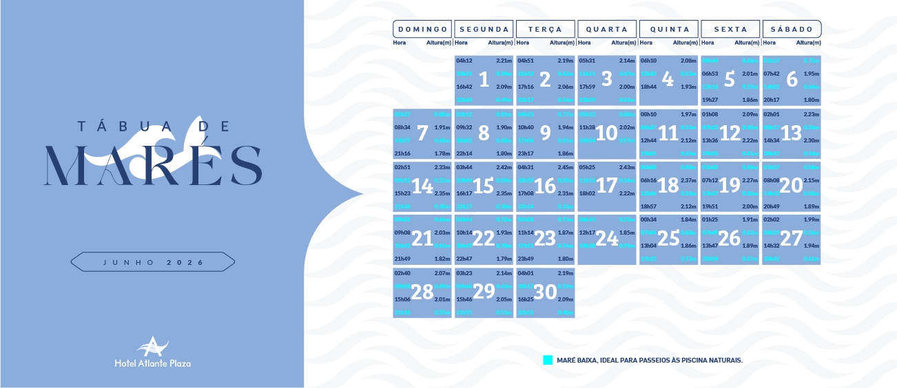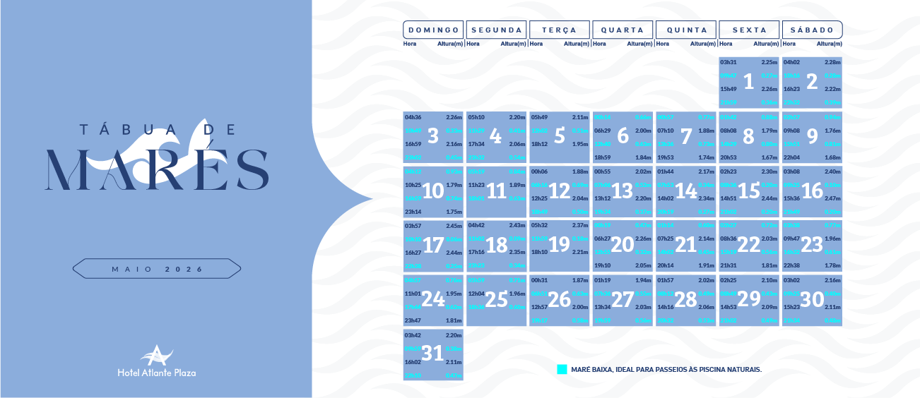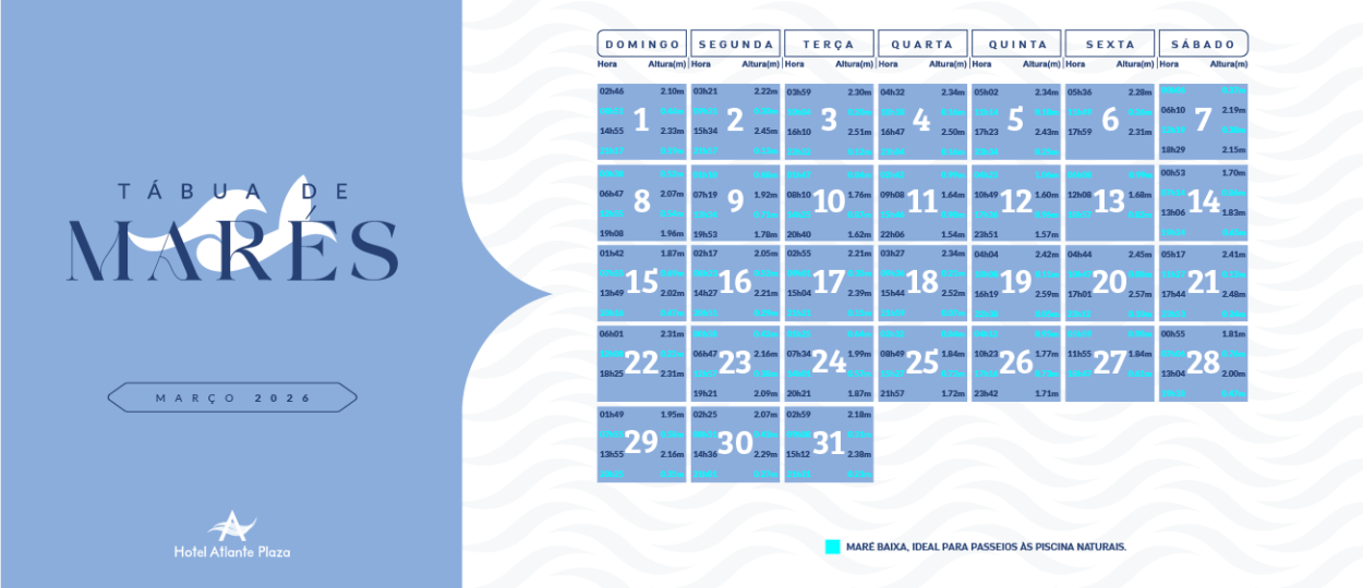 Para saber os melhores horários de maré baixa em frente ao Hotel Atlante Plaza, observe as informações de maré nas imagens abaixo.
