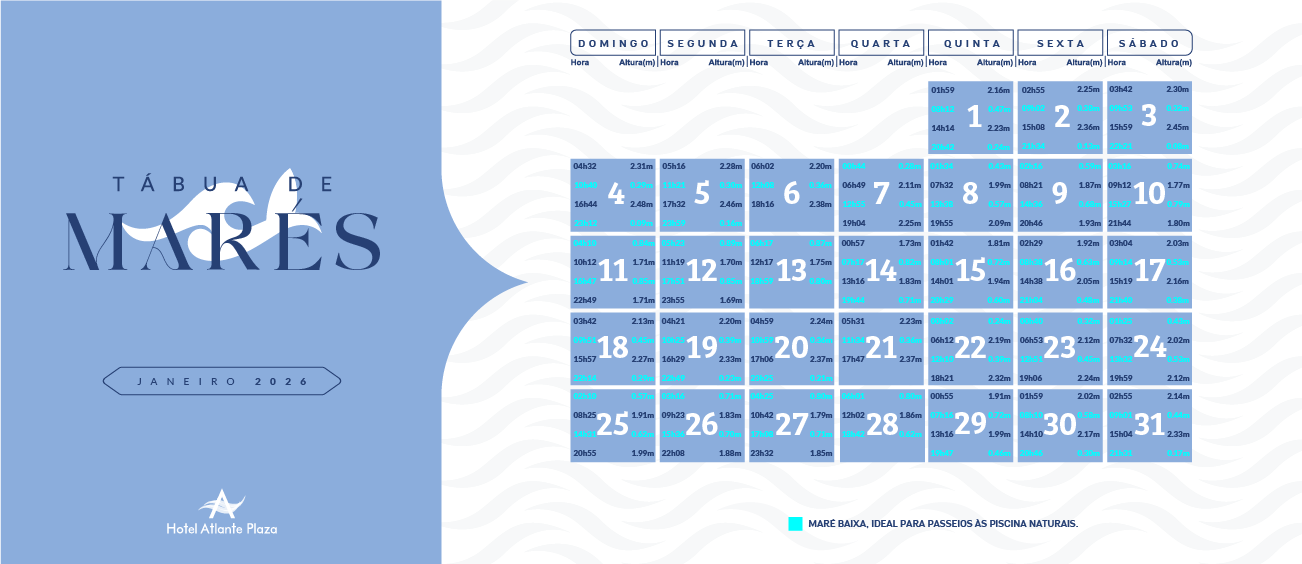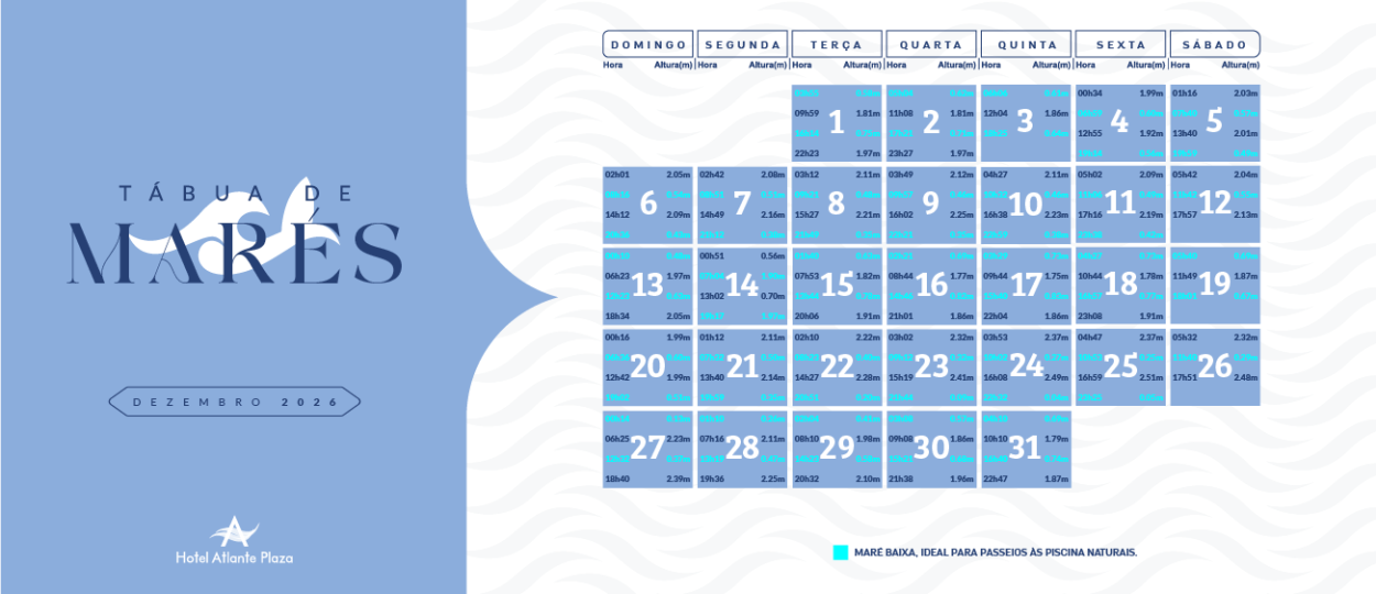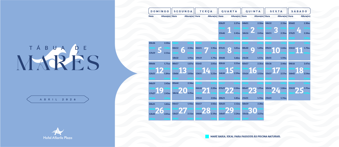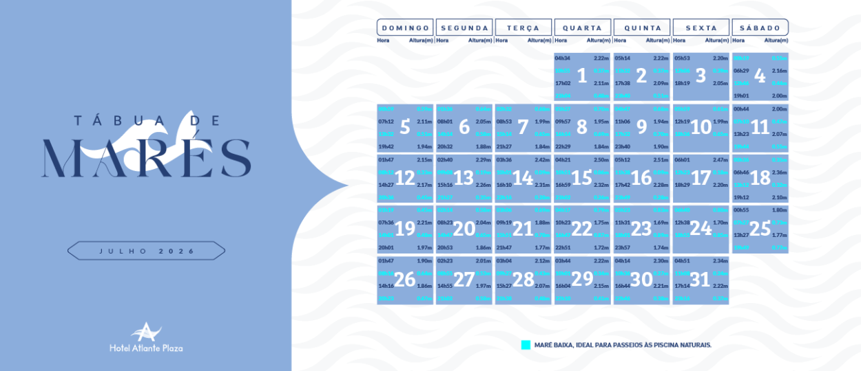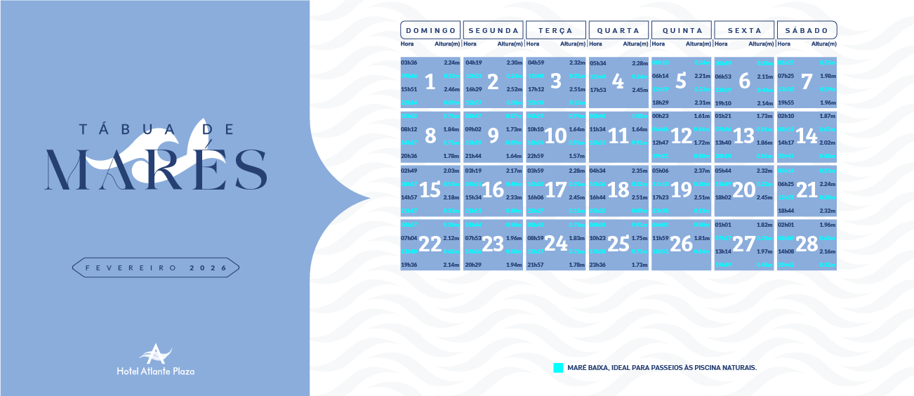 Para saber os melhores horários de maré baixa em frente ao Hotel Atlante Plaza, observe as informações de maré nas imagens abaixo.